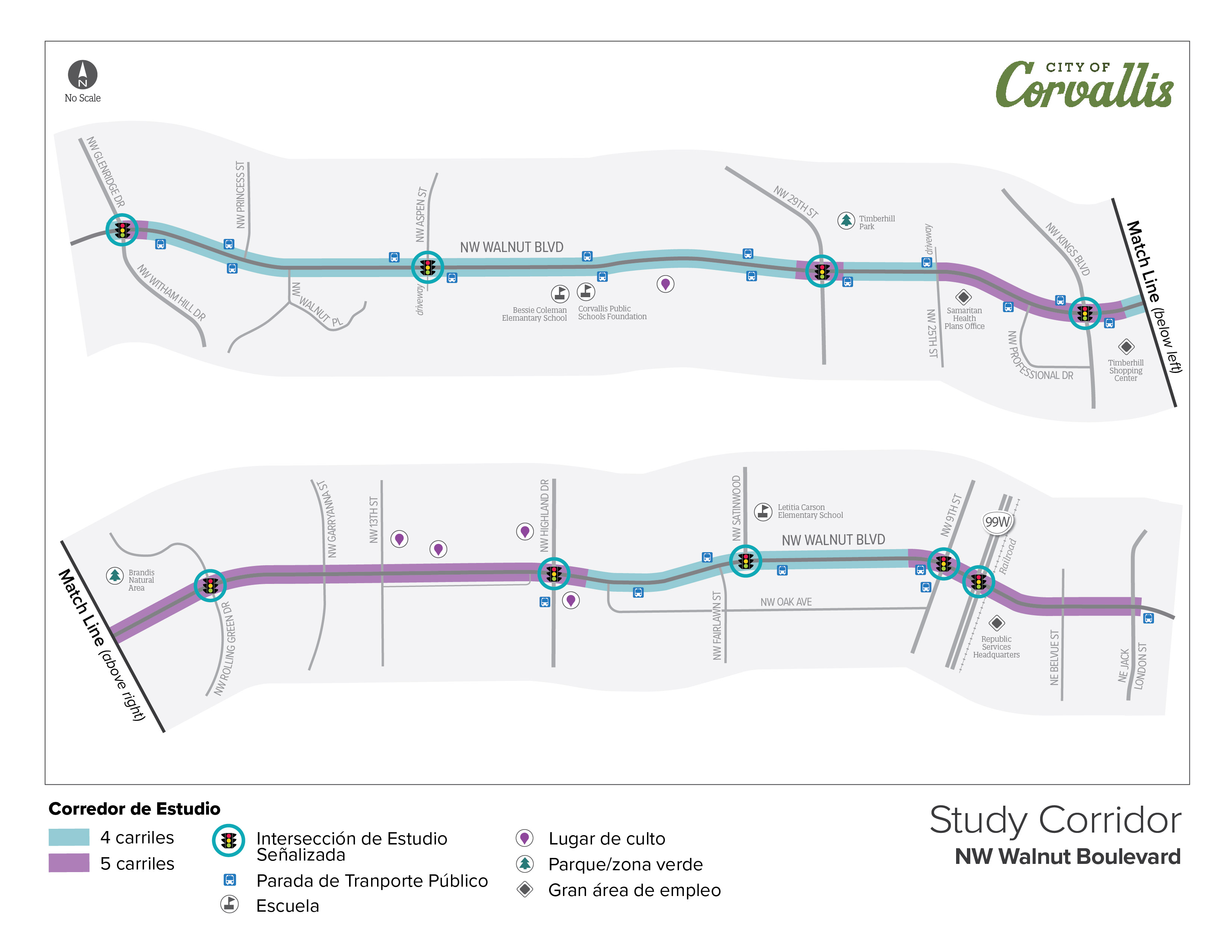 - Reconfigurar el corredor de cuatro carriles a tres carriles (un carril en cada sentido con un carril central de doble sentido para girar a la izquierda)*