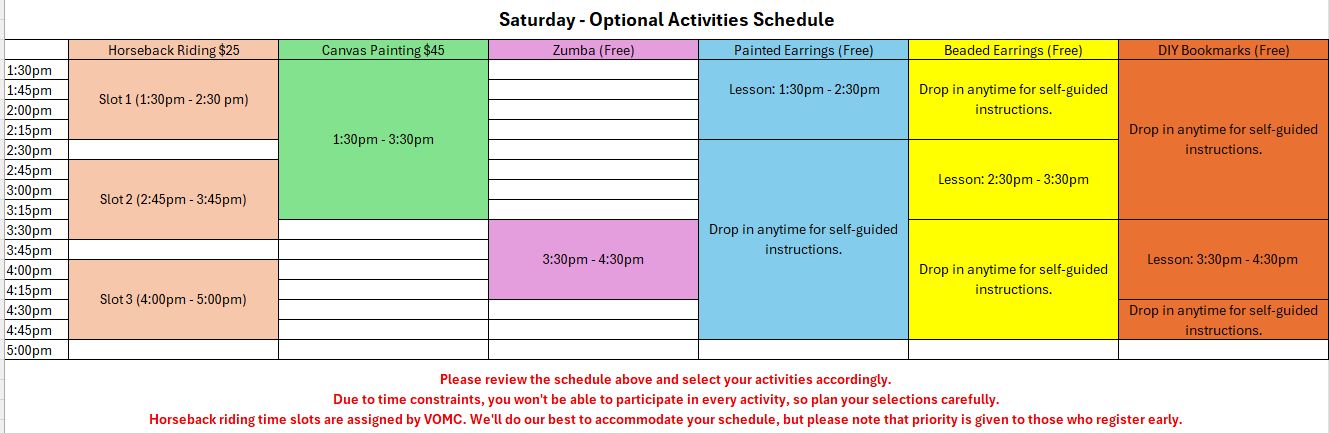 8:30 - 9:30 am Breakfast9:45 - 10:00 am Announcements10:00 - 10:15 am Worship10:15 - 11:15 am Training Tip #211:15 - 12:15 pm Snack & Breakout Groups, Discussion & Prayer12:15 - 12:30 pm Practical Application Project12:30 - 1:30 pm Lunch1:30 - 4:45 pm Free-Time Electives Horseback riding: 1hr timeslots (3): 1:30-4:45pm Canvas Painting: 1:30-3:30pm Zumba Class: 3:30-4:30pm4:30 - 5:00 pm Q/A Book Table, Donations5:00 - 6:00 pm Dinner6:15 - 6:20 pm Announcements6:20 - 7:20 pm Olympic Games in Teams7:30 - 7:50 pm Worship7:50 - 8:50 pm Training Tip #38:50 - 9:20 pm Snack & Breakout Group9:30 - 10:00 pm Book Table & Donations